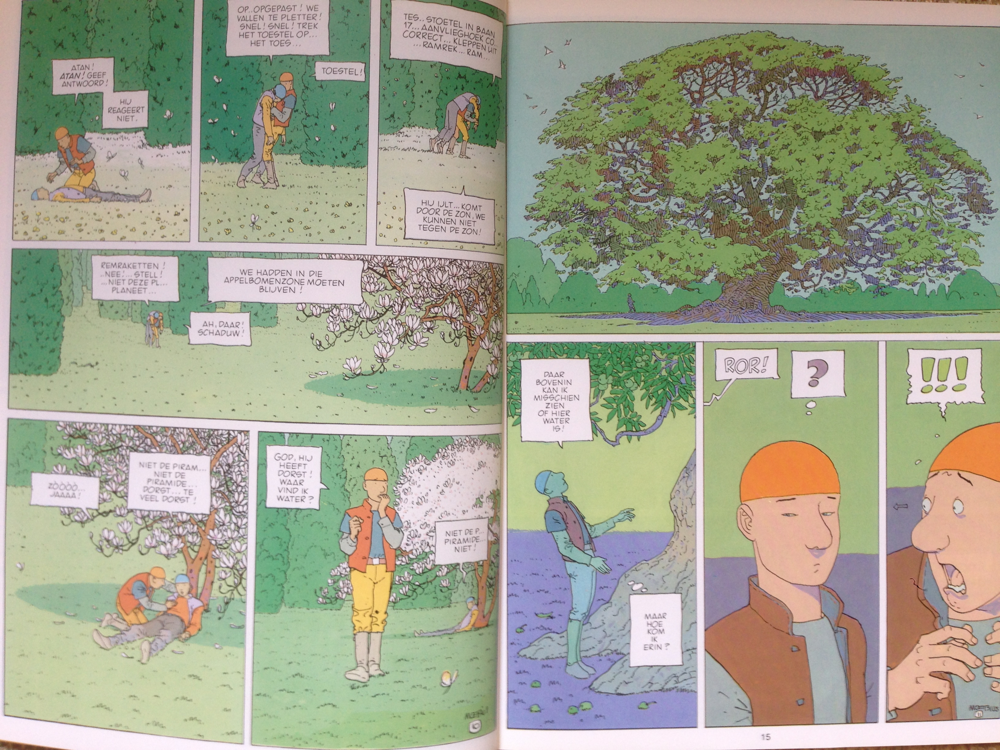 Again illustration and writing is done by only one person. The surrealist environments and plot of the whole Philémon series is unprecedented. It is full of hallucinatory environments and intellectual jokes. On these two pages Philémon is once again, searching for his friend Bartholomee and has been transported by a portal entrance to another realm where the laws of physics are different. We see him swimming in an ocean and he is just as surprised as we, that the water is being hoisted onto a roll, because of the tide change. The tide-changers must do this, otherwise things will not be as organised any more. A literal visualisation of an almost childlike understanding of eb and flood. This specific scene reminds me of such an innocent apprehension of natural phenomenon. An apprehension that is allowed as a landscape experience, but is refuted as a scientific failure of understanding. Landscape experiences are however by definition defying any objective claim to truth, they help us to believe in the impossible and the implausible. Landscapes can, as I am convinced of, muster in any grown-up, a sense of the impossible and therefore inspire to hope and proceed, even if the planet is decaying.