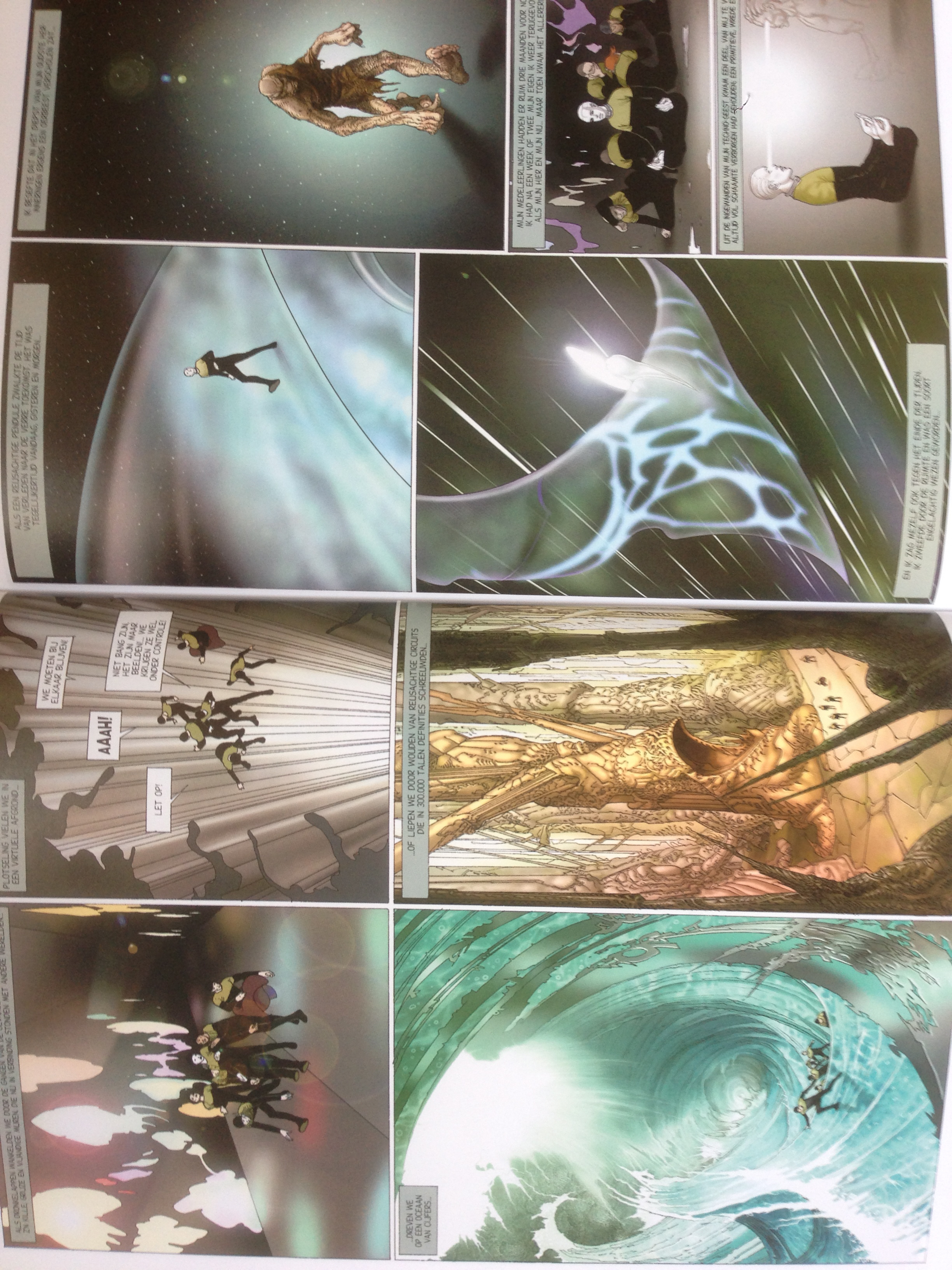 This is the universe that Storm (and earthling) has entered after falling into the red spot on Jupiter (as an astronaut). In this second half of the series, he is on the living planet Pandarve. A fascinating version of mother earth. The detailed drawings are realistic and cinematographic. They are full of depth and readable expressions. They are also full of light and shade and reflexion. Allowing the illustrations to be very atmospheric and renderable to the many diverse environments of Pandarve. Here we see Storm in a purple sea, with a living helmet, diving to the bottom. Next we see him in an almost antique earth-like fisher boat, heaving up a harness. Next we see, from a distance perspective the boat sailing towards a very big tree on possibly the only island on this small orbiting water planet, in the interstellar space surrounding Pandarve. And such extreme environmental changes are kept at this fast pace throughout the book. These fantastic changes in atmospheric landscapes make me drool and wish for many future design assignments, to see whether I could match them.